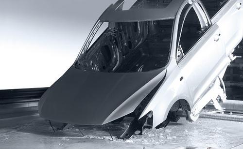 例如在陰極電泳涂裝中(工件接負極作為陰極,陽極接正極),陰極電泳漆(R-N)通過醋酸CH3COOH(或者乳酸等其他有機酸)中和形成水溶性的R-NH+和CH3COO-。接通直流電源施加外加電場后,工件附近因為水的電解產(chǎn)生OH-形成高堿性界面,各帶電荷離子定向移動,水溶性的R-NH+移動到陰極區(qū)域與OH-反應(yīng)生成不溶性電泳涂膜,并沉積在車身表面。其在陰極區(qū)的反應(yīng)式:RNH++ OH-→RN(不溶性沉積漆膜)+H2O。
