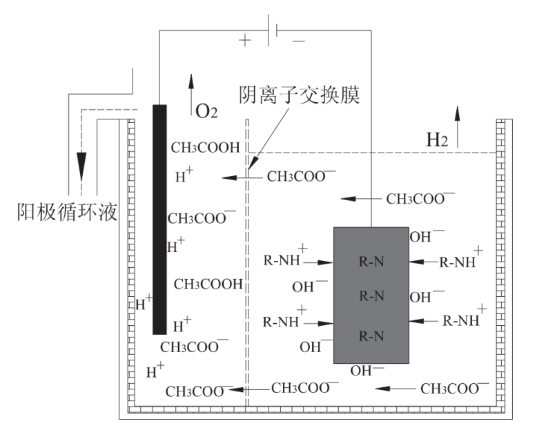 同時,電泳槽液中不斷產(chǎn)生CH3COO-,當(dāng)它聚積過多時將直接導(dǎo)致pH降低和電導(dǎo)率增高。為了除去電解過程不斷產(chǎn)生的CH3COO-,以及陽極區(qū)域產(chǎn)生的H+就需要增加陽極系統(tǒng),將電泳槽液中的CH3COO-轉(zhuǎn)移到陽極液中,與陽極區(qū)域的H+反應(yīng)生成CH3COOH通過陽極液循環(huán)排放,得以保持電泳槽液的pH和電導(dǎo)率穩(wěn)定,從而獲得穩(wěn)定優(yōu)質(zhì)的電泳漆膜。其在陽極區(qū)的反應(yīng)式:CH3COO-+ H+→CH3COOH。