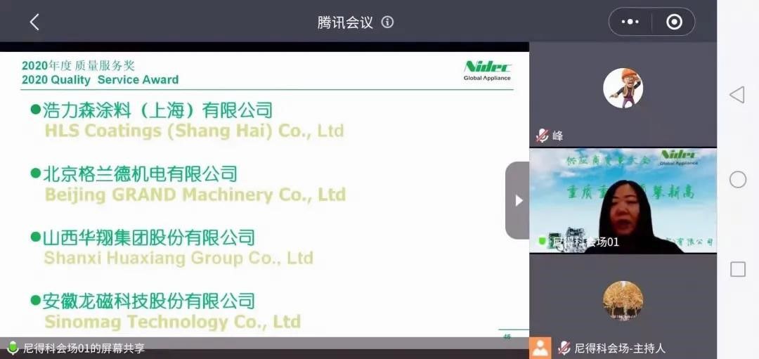 2021年1月,尼得科壓縮機(北京)有限公司舉行了"2020年度供應商質(zhì)量大會",由于疫情影響,為了響應國家號召,避免人員聚集,此次大會采用線上直播形式,全球各地的優(yōu)秀經(jīng)銷商代表、優(yōu)秀供應商、以及其他相關(guān)部門工作人員等共同參與了此次直播。浩力森涂料榮獲了尼得科壓縮機“質(zhì)量服務獎”,載譽而歸。