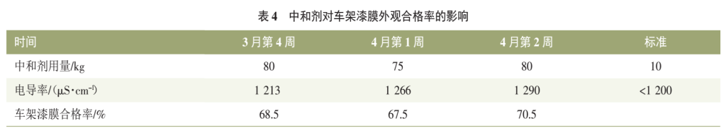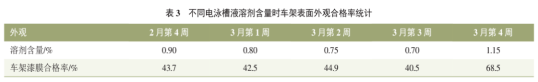現(xiàn)場(chǎng)電泳槽液溶劑含量雖在工藝要求范圍內(nèi),但是整體偏低,提高溶劑含量可以明顯降低電泳漆膜外觀缺陷的發(fā)生率。2021年3月第4周一次性補(bǔ)加600kg溶劑,提高溶劑含量0.3%,漆膜外觀問題明顯改善,車架漆膜合格率由40%提升至68%。