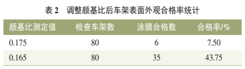 電泳涂裝的顏基比指電泳漆、槽液或漆膜中的顏料與基料(樹脂)之比,電泳槽液和新配的電泳原漆槽液顏基比應(yīng)是相同的,但在電泳過程中,顏料和樹脂不定按照原配比沉積到被涂物上,因而產(chǎn)生槽液、漆膜和原漆三者的顏基比不相同的現(xiàn)象,電泳槽液顏基比失調(diào)易產(chǎn)生縮孔粗糙、失光等漆膜弊病,影響漆膜性能,因此需要定期檢測(cè)槽液顏基比,按檢測(cè)結(jié)果添加乳液或色漿調(diào)整槽液的顏基比。電泳槽液顏基比技術(shù)要求在0.14~0.20范圍內(nèi),按照Q/JQ11219.4《涂料灰分、顏基比測(cè)定方法》進(jìn)行檢測(cè),顏基比雖在工藝要求范圍內(nèi),但是在明顯升高,通過調(diào)整顏基比范圍,使其降低至0.165左右,發(fā)現(xiàn)車架外觀糙合格率由7.5%提升至43.75%(見表2),故顏基比失調(diào)為電泳漆膜外觀的主要影響因素。