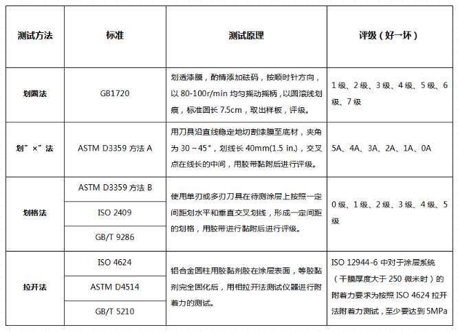 漆膜附著力是考核漆膜性能好壞的重要指標(biāo)之一,是指漆膜與被涂物體表面之間通過物理或化學(xué)作用相互黏結(jié)的能力,是一種界面作用力,包括涂層與基體表面的黏附力及涂層本身的內(nèi)聚力。只有當(dāng)漆膜具有了一定的附著力,才能牢牢地附著在被涂物體表面,發(fā)揮涂料所具有的裝飾性和保護(hù)作用。 . 涂層附著力的檢測方法主要有劃圈法、劃格法、劃“×”法和拉開法。不同的檢測方法,相應(yīng)的標(biāo)準(zhǔn)見下表。其中劃圈法和拉開法不適用于涂裝現(xiàn)場的涂膜附著力檢查,只適合于實驗室內(nèi)涂膜性能的檢測。 根據(jù)上表,結(jié)合電泳涂層及面漆復(fù)合涂層膜厚特性進(jìn)行選擇,電泳漆的膜厚大致在10μm-40μm,在實驗室中常用于劃格法1mm間距;而面漆的膜厚通常在60μm-120μm,實驗室中常用于劃格法2mm間距。 . 附著力受金屬基材、涂料品質(zhì)、施工工藝、涂裝過程管控等綜合作用影響。其中,不同基材的附著力底漆與不銹鋼、鋁材等基材附著力較差,與冷軋鐵件或拋丸鑄鐵件等具有良好的附著力。 . 本文作者:浩力森應(yīng)用工程中心 王惠影
