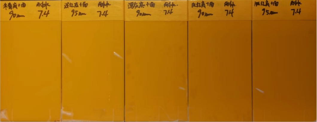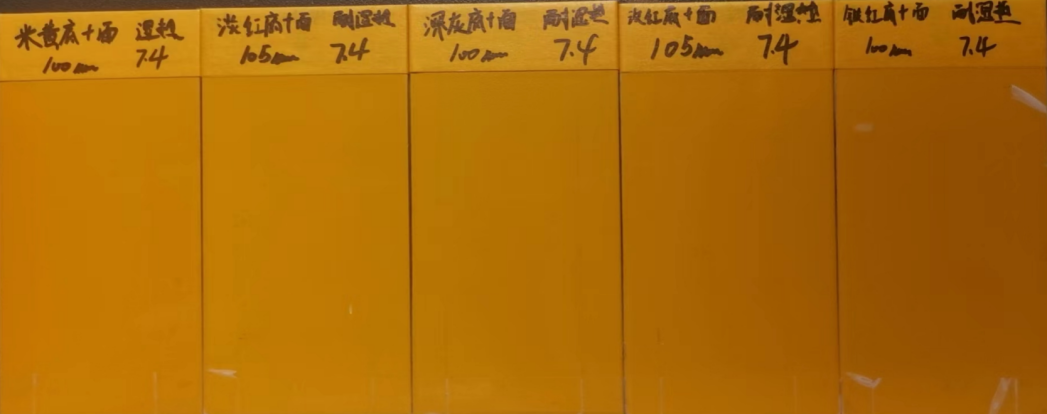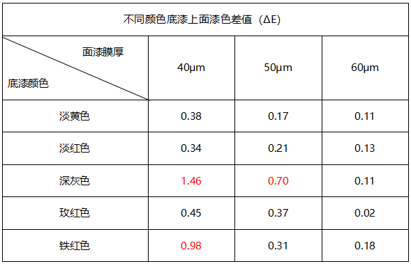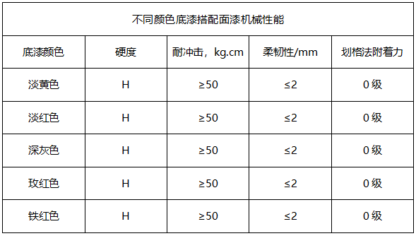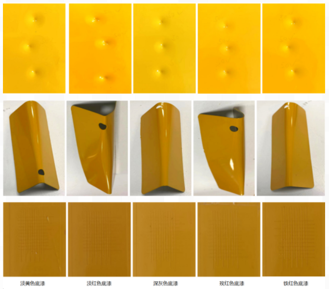 隨著產(chǎn)品的個(gè)性化發(fā)展,異色系底漆在工程機(jī)械上的應(yīng)用越來越廣泛,本文我們通過一系列試驗(yàn)驗(yàn)證異色系底漆不同顏色對配套面漆的影響,下面以配套工程黃色面漆為例,選擇淡黃、淡紅、深灰、玫紅、鐵紅5種不同顏色的底漆來進(jìn)行實(shí)驗(yàn)驗(yàn)證。 . 實(shí)驗(yàn)1:不同顏色底漆配套面漆光澤對比 實(shí)驗(yàn)?zāi)康模候?yàn)證面漆在不同顏色的底漆上光澤數(shù)據(jù)的差異 儀器:BYK三角度光澤儀 測試數(shù)據(jù): 實(shí)驗(yàn)結(jié)論:不同顏色底漆對于面漆光澤影響不大 實(shí)驗(yàn)2:不同顏色底漆配套面漆光澤對比 實(shí)驗(yàn)?zāi)康模候?yàn)證在不同顏色的底漆上面漆梯度膜厚的色差值 儀器:愛色麗 AM-94 測試數(shù)據(jù): 實(shí)驗(yàn)3:不同顏色底漆配套面漆機(jī)械性能對比 實(shí)驗(yàn)?zāi)康模候?yàn)證不同顏色的底漆對面漆機(jī)械性能的影響 測試數(shù)據(jù): 測試照片: 實(shí)驗(yàn)4:不同顏色底漆配套面漆耐水性能對比 實(shí)驗(yàn)?zāi)康模候?yàn)證不同顏色的底漆對面漆耐水性能的影響 測試數(shù)據(jù):23℃耐水性測試480小時(shí)無起泡、無生銹 測試照片: 實(shí)驗(yàn)結(jié)論:不同顏色底漆對于配套面漆耐水性能無影響 實(shí)驗(yàn)?zāi)康模候?yàn)證不同顏色的底漆對面漆耐濕熱性能的影響 測試數(shù)據(jù):耐濕熱性測試480小時(shí)板面無起泡、不生銹、不開裂 測試照片: 實(shí)驗(yàn)結(jié)論:不同顏色底漆對于配套面漆耐濕熱性能無影響 綜上所述: 1. 異色系底漆顏色越深,對面漆色差影響越大,面漆耗量越高,綜合成本也越高。底漆的顏色、涂料因厚度改變而產(chǎn)生的光澤改變等因素在涂料調(diào)色乃至涂裝過程中必須考慮充分。 2. 在實(shí)際生產(chǎn)過程中,選擇異色系底漆顏色越深,越容易造成工件R角、銳角、邊緣遮蓋不良等問題。 3. 底漆顏色對于配套板機(jī)械性能、耐性基本無影響。 .