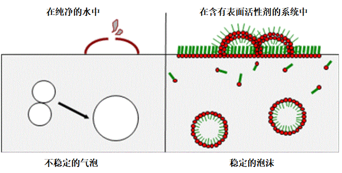 這些表面活性劑分子具有疏水和親水端的特性,在氣泡周圍形成一層分子層,其中疏水端朝向氣泡,親水端朝向水。這樣降低了氣泡和液體之間的界面張力,穩(wěn)定了氣泡的存在。當(dāng)氣泡升至液體表面時(shí),由于空氣和液體界面上存在表面活性分子,形成了包括氣泡上的表面活性劑層和液體表面活性劑層的穩(wěn)定雙層。這個(gè)穩(wěn)定雙層由空氣-液體界面上的表面活性劑單層和液體-空氣界面上的表面活性劑單層組成。