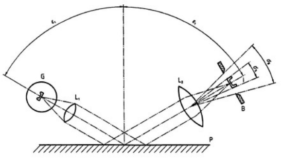光澤度儀器的原理,是用一個(gè)光源和一個(gè)接收器,來測量材料表面的反射光通量的大小。如果儀器調(diào)校以后,環(huán)境溫度有變化,導(dǎo)致光源的發(fā)光效率變化,那么光源發(fā)光效率變化的誤差就會(huì)直接體現(xiàn)在測量數(shù)據(jù)中。如果有溫度補(bǔ)償功能,那么溫度變化引起的發(fā)光效率變化,能夠得到補(bǔ)償,保證光源的發(fā)光效率不變。光澤度計(jì)的測量原理如圖《測量原理》所示。儀器的測量頭由發(fā)射器和接受器組成,發(fā)射器由白熾光源和一組透鏡組成,它產(chǎn)生一定要求的入射光束。接受器由透鏡和光敏元件組成,用于接受從樣品表面反射回來的錐體光束。