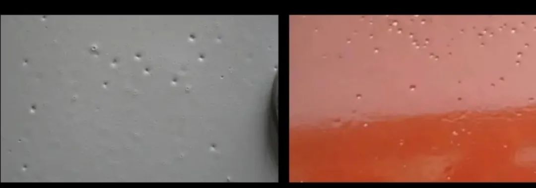 當現(xiàn)場工件外觀出現(xiàn)問題時,小編認為首先應進行全面排查以確定問題的根源。 1.縮孔: 這類缺陷在濕的漆膜上看不見,當烘干后漆膜表面出現(xiàn)直徑通常為0.5-3.0mm漏底微孔、不漏底的火山口狀的凹陷,稱為陷穴、凹坑,露底者為縮孔。由于電泳漆濕膜中或表面有塵埃、油漬或與電泳涂料不相容的粒子,成為陷穴中心,因而產生涂膜缺陷。很多情況下這類缺陷還與被涂物的材質有關,如金屬底材上存在微裂紋和微孔等。 . 原因1: 外來油污污染電泳漆膜,油污附著在工件表面,使電泳漆成膜受到影響。這種原因引起縮孔的幾率較大。 解決方法: 可檢查輸送機構、掛具,防止油滴污染漆膜。從電泳設備制造安裝開始就要避免上述物質污染,每一種新零件投入電泳前最好進行相關檢驗,防止受油、硅油、蠟、脂性碳化物、膠水等污染物對工件,電泳設備及電泳槽液的污染。 . 原因2: 前處理除油不干凈,造成潤濕性不良,使電泳漆烘干后漆膜有縮孔。 解決方法: 加強前處理清洗。 . 原因3: 槽液有油污、異物混入,影響電泳漆膜外觀。 解決方法: 用吸油棉或除油過濾袋吸去油污,清除槽液內異物,同時避免異物混入,保持電泳槽液清潔。 . 原因4: 加漆時有電泳漆沒攪拌均勻,使槽液無完全熟化,引起漆膜不良。 解決方法: 確保加入的電泳漆攪拌均勻,加強槽液循環(huán),使槽液完全熟化。 . 原因5: 電泳后水洗中含油分或烘干室內不潔凈,循環(huán)風含油分,使油分附著在漆膜上面烘干后有縮孔。 解決方法: 水洗經(jīng)常更換,烘箱經(jīng)常清理.烘箱鏈軌用油可選用耐高溫,不會高溫揮發(fā)為最佳。 2.顆粒: 指電泳漆膜表面上有異物的現(xiàn)象;在烘干后的電泳涂裝表面上會有手感粗糙的較硬粒子,或肉眼可見的細小顆粒。 . 原因1: 電泳液中存在較粗大的雜質 解決方法: 檢查電泳槽過濾裝置,加強電泳槽液的過濾。 . 原因2: 車間空氣中含有的塵埃等漂浮物飄落到放在滴干區(qū)的工件上 解決方法: 做好涂裝車間衛(wèi)生,防止灰塵漂浮。 . 原因3: 烘箱內存在灰塵等雜物 解決方法: 烘箱烤爐。 . 原因4: 前處理清洗不干凈 解決方法: 加強前處理水洗及除油。 . 原因5: 金屬工件表面有顆粒,如毛刺或電鍍面起泡 解決方法: 工件上掛前,先檢查工件表面是否有問題。 . 3.涂膜過薄: 涂膜過薄指電泳后工件表面漆膜厚度過薄,造成顏色光澤和遮蓋力不理想,質量等級下降。 Q1: 電壓過低 解決方法: 升高電壓。 . Q2: 電泳時間不夠 解決方法: 延長電泳時間。 . Q3: 槽液電導率偏低 解決方法: 減少UF液排放。 . Q4: 被涂物通電不良 解決方法: 清理掛具,使被涂物通電良好。 . Q5: 溶劑含量偏低 解決方法: 補充溶劑,一般為槽液量的2%-5%。 . Q6: 槽液固體份偏低 解決方法: 提高固體份至工藝范圍內 . Q7: PH不當(一般偏低) 解決方法: 調整PH值。 . Q8: 槽液溫度偏低 解決方法: 提高槽液溫度。 . Q9: 極板連接不良或被腐蝕,導電桿連接不良 解決方法: 檢查極板、導電桿電線連接,定期清理極板.導電桿和更新電線。 4.橘皮: 電泳漆膜表面形成像橘皮一樣連續(xù)的波浪狀態(tài)。這種缺陷通常是由于涂料流平性不好而造成,應調整槽液涂料。 Q1: 槽液溶劑含量低 解決方法: 補充適量助溶劑。 Q2: 補給原漆時沒有充分熟化 解決方法: 原漆補加前進行充分的攪拌。 Q3: 電泳電壓過高,時間過長,使涂膜過厚 解決方法: 適當降低電泳電壓,減短電泳時間。 Q4: 槽液pH值高 解決方法: 加助劑調整pH值。 Q5: 槽液顏基比過低 解決方法: 補充顏基比較高的電泳漆。 Q6: 槽液中雜質離子過多,電導率過高 解決方法: 超濾處理至350—750μS/cm。 5.顏色不均勻: 是指涂層烘烤固化后,其顏色的深淺程度不一樣,漆膜花臉。 (1)陰陽面 Q1: 槽液顏基比不合適 解決方法: 調整顏基比 Q2: 工件在電泳槽中的位置不當; 解決方法: 工件應保持在電場中心線與槽兩邊電極平行且距離相等。 (2)在同一面上的色澤不一致 Q1: 槽液中的顏料分散不均勻 解決方法: 加強對槽液攪拌循環(huán)。 Q2: 固體份含量過低 解決方法: 調整槽液固體份至合適范圍內。 Q3: 零件形狀復雜或上掛方式不對,導致電場被屏蔽 解決方法: 改進掛具,安裝輔助電極。 Q4: 工件在入電泳槽前氧化,有黑印 解決方法: 工件進電泳槽前檢查底材顏色是否一致。 Q5: 槽液內溶劑含量過低而引起色漿分散不好 解決方法: 適量補加溶劑,一般為槽液量的2%-5%。 Q6: 溶劑含量過多或電導率過高,引起電泳漆膜不均勻 解決方法:超濾處理。 6.針孔: 工件上有露底針狀小孔,稱為針孔,它與縮孔的區(qū)別是孔徑小,中心無異物,且四周無漆膜堆積凹起。由漆膜再溶解而引起的針孔,稱為再溶解針孔。 濕透針孔: 工件未進行烘烤,在空氣中涼干,可看到的針孔。 Q1: 電泳電壓過高,電流沖擊反應過劇,產生氣泡過多,或升壓速度過快。 解決方法: 適當降低電壓,加長軟啟動時間。 Q2: 溶劑含量偏低。 解決方法: 添加溶劑,一般為槽液量的2%-5%。 Q3: 槽液溫度過低。 解決方法: 控制槽液溫度。 Q4: 涂料的PH值過低及溶劑過多,使漆膜抵抗雜質能力變弱。 解決方法: 提高涂料的PH,并將漆膜厚度控制在必要的范圍內。 Q5: 槽液雜質離子過高,電解反應劇烈,被涂物表面產生的氣體多。 解決方法: 超濾除去雜質離子。 烘干后針孔 Q1: 固體份過低 解決方法: 提高槽液固體份。 Q2: 溶劑含量過低 解決方法: 提