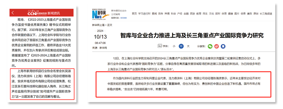 近日,浩力森受邀參加了由上海市商務(wù)委員會支持、上海社會科學(xué)院主辦的2024長三角重點(diǎn)產(chǎn)業(yè)國際競爭力優(yōu)秀企業(yè)案例交流暨第二輪案例征集啟動儀式。 . 據(jù)悉,2023年,在長三角產(chǎn)業(yè)國際競爭力合作聯(lián)盟的倡議下,上海社會科學(xué)院與行業(yè)協(xié)會共同評選出了首屆長三角重點(diǎn)產(chǎn)業(yè)國際競爭力優(yōu)秀企業(yè)案例,共有10大案例脫穎而出,并在加入專家點(diǎn)評后集結(jié)成書。同時,會上還公布了《2023-2024上海重點(diǎn)產(chǎn)業(yè)國際競爭力優(yōu)秀企業(yè)案例》的征集規(guī)則與重點(diǎn)方向。 人民日報 / 新華網(wǎng) 此次會議吸引了包括人民日報、新華網(wǎng)、文匯報、解放日報在內(nèi)的眾多國家級主流媒體的高度關(guān)注與廣泛報道。 作為國內(nèi)涂料行業(yè)的生力軍和民營企業(yè)代表,浩力森的代表在會上衷心感謝上?;ば袠I(yè)協(xié)會的活動邀請,并進(jìn)一步指出,近年來,主要發(fā)達(dá)經(jīng)濟(jì)體對中國發(fā)起的貿(mào)易摩擦確實(shí)給行業(yè)發(fā)展帶來了不少挑戰(zhàn),但同時也為那些有實(shí)力、勇于創(chuàng)新的中國企業(yè)帶來了新的機(jī)遇。 . 浩力森憑借自身的實(shí)力和創(chuàng)新精神,在國內(nèi)市場的占有率穩(wěn)步提高,同時,“走出去”戰(zhàn)略也已持續(xù)實(shí)施了六年,前景十分廣闊。